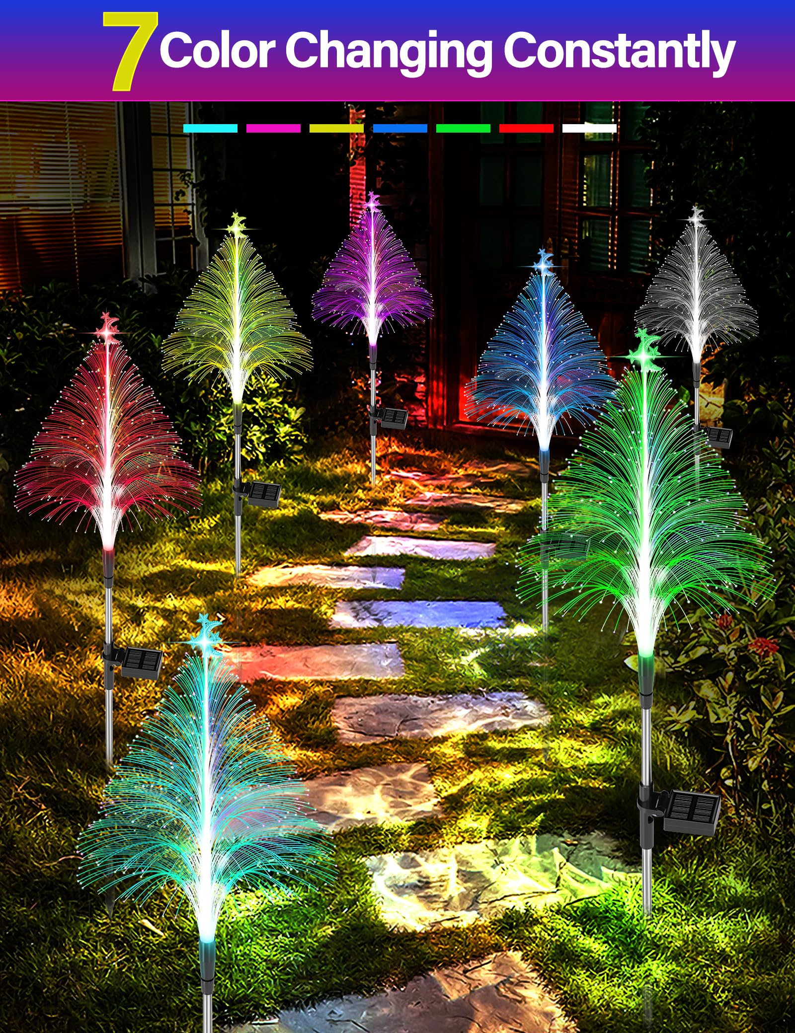 Transform your outdoor space into a mesmerizing wonderland with our captivating 7 Color Changing Solar Christmas Trees Lights. Illuminate your surroundings with their enchanting glow, gracefully shifting between vibrant hues.